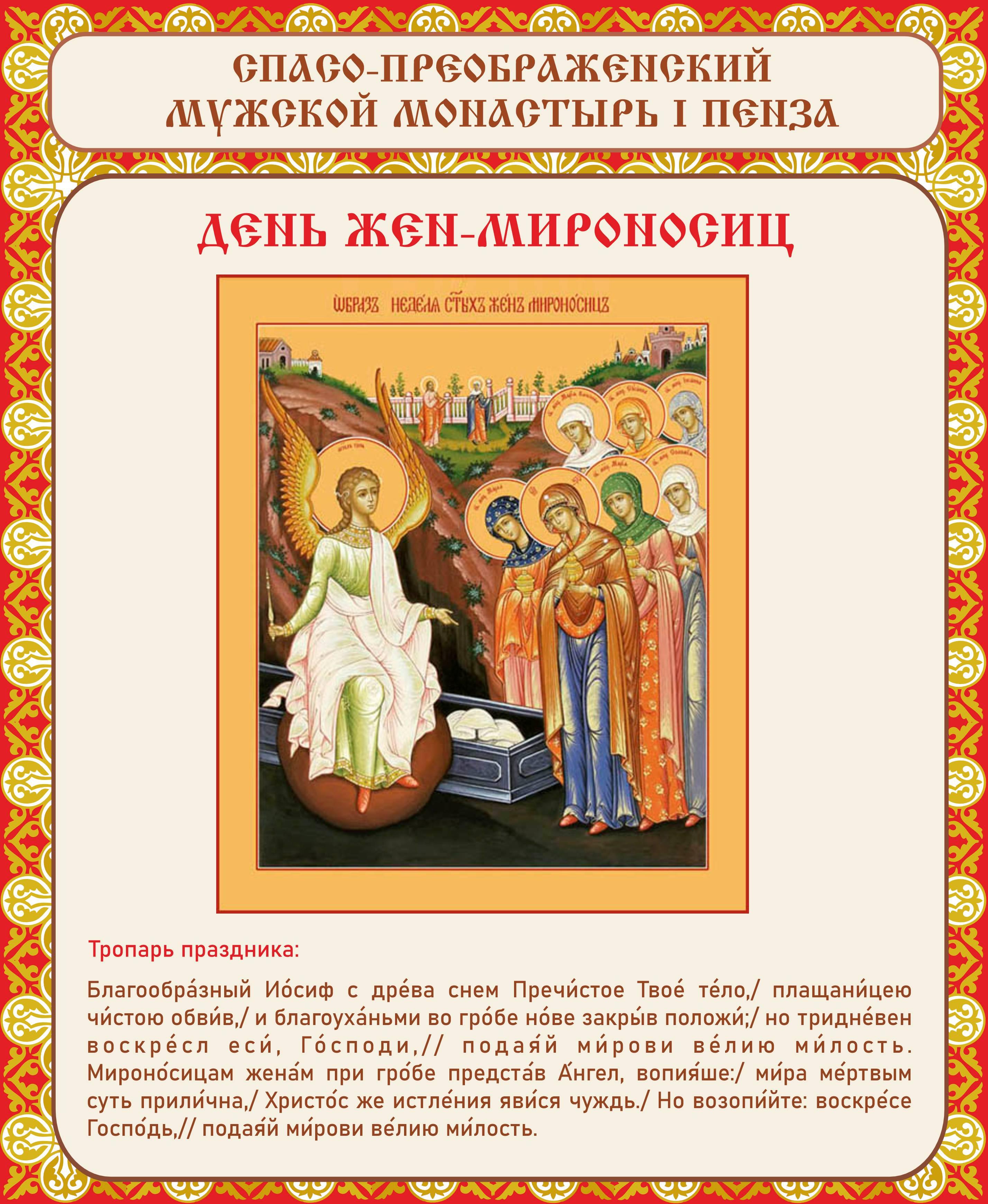 Неделя 3-я по Пасхе, жен-мироносиц. Правв. Марфы и Марии, сестер прав. Лазаря. Блгв. Тамары, царицы Грузинской