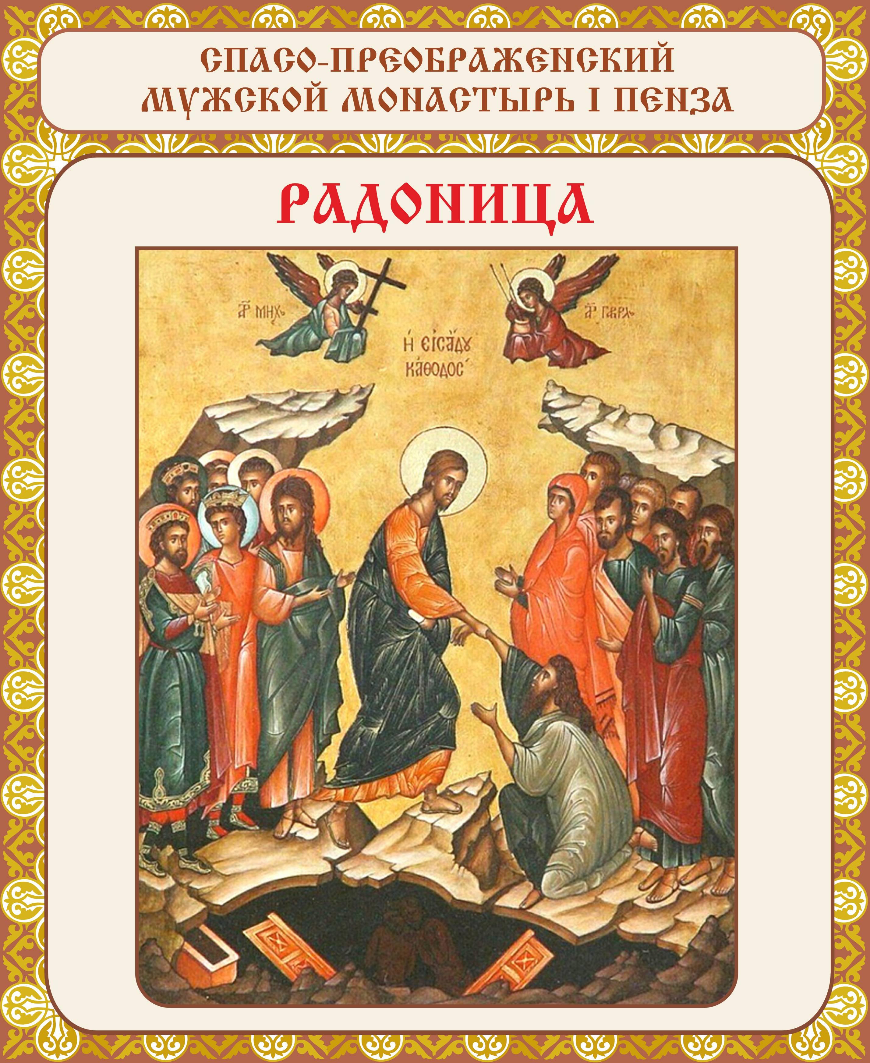 РАДОНИЦА. Поминовение усопших Апп. Иродиона, Агава, Асинкрита, Руфа, Флегонта, Ерма и иже с ними. Свт. Нифонта, еп. Новгородского. Прп. Руфа, затворника Печерского, в Дальних пещерах.Мч. Павсилипа. Свт. Келестина, папы Римского.Сщмч. Сергия Родаковского пресвитера.